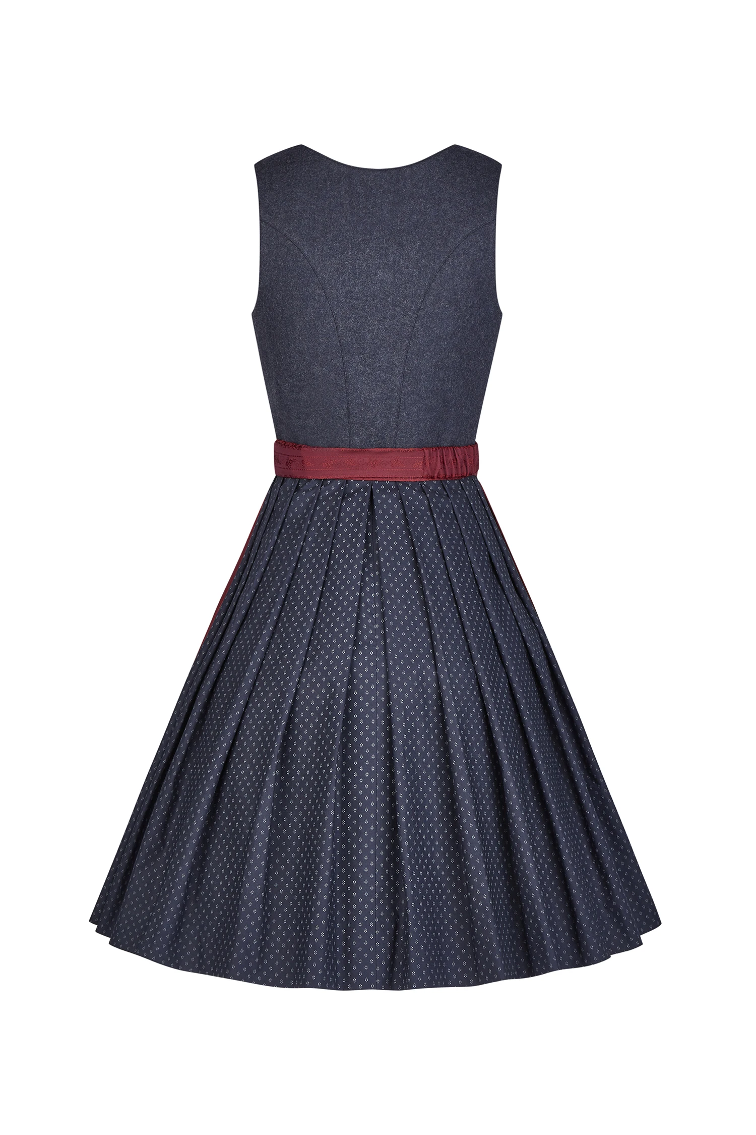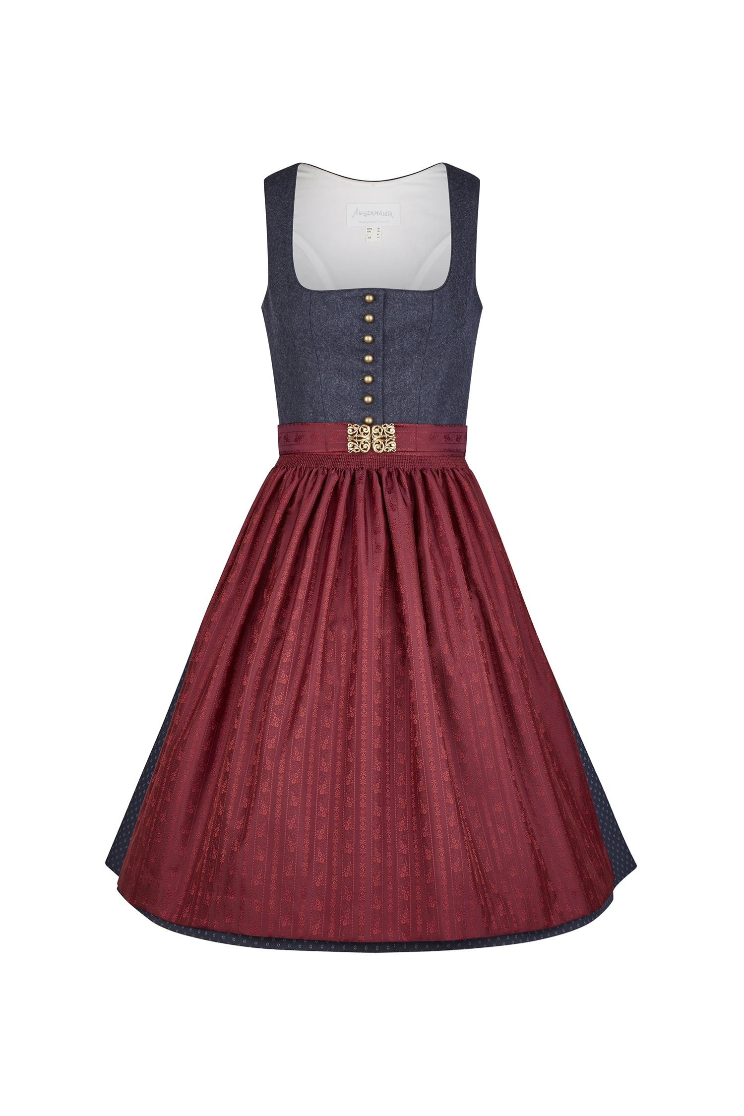 Dirndl „Ines“ aus unserer Kollektion überzeugt durch sein sattes Marine Blau. Ein tiefer Ausschnitt bietet perfekten Raum für eine ideale Angermaier Bluse, sowie Schmuck der hier perfekt in Szene gesetzt werden kann. Der Lodenstoff am Oberteil gibt sicheren halt und wird mit silbernen Knöpfen geschlossen. Eine Bordeauxrote Schürze rundes Dirndl perfekt ab und wird mit einer Schließe geschlossen. Das Dirndl hat eine Länge von 65cm