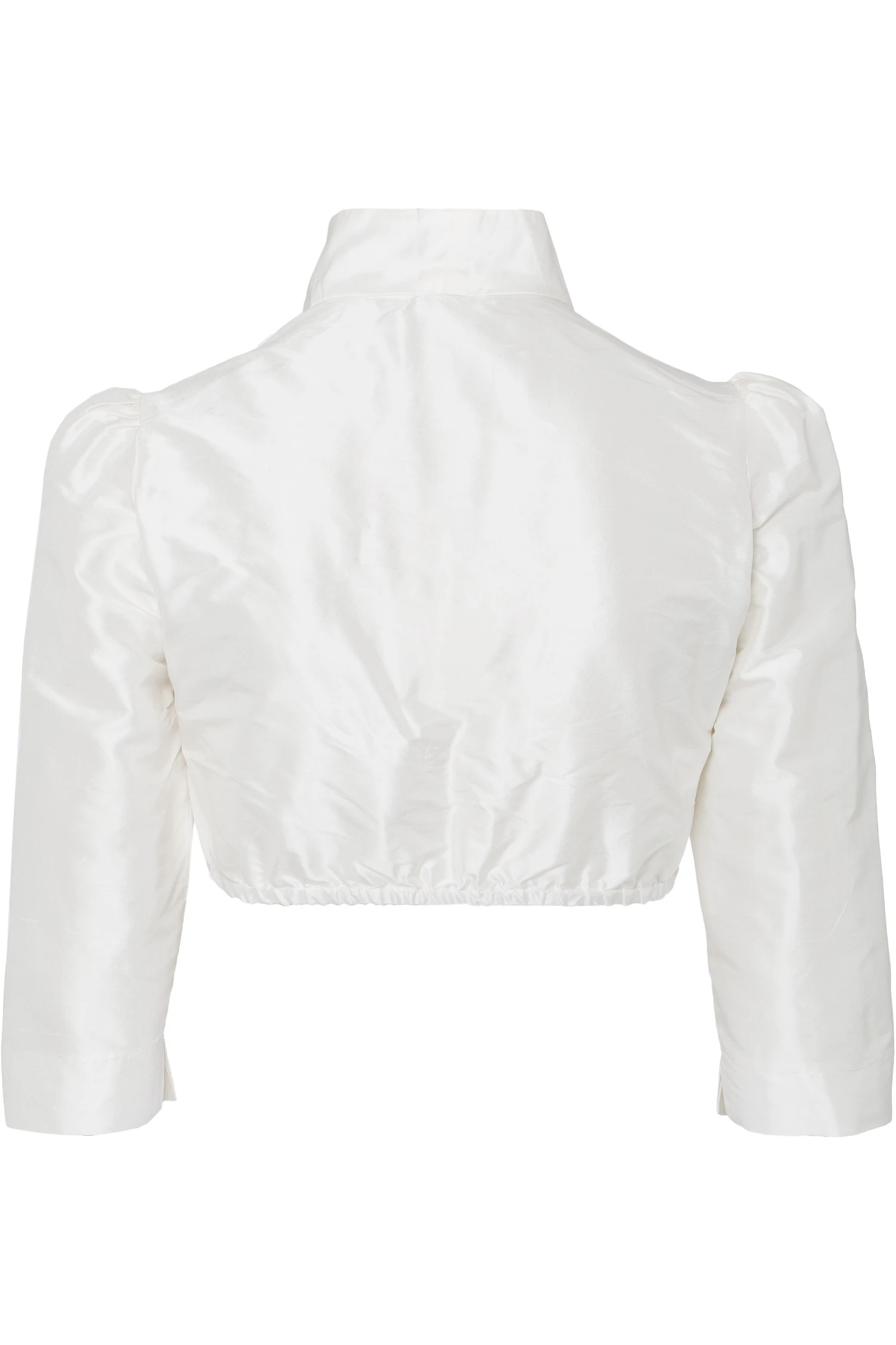 Die weiße Bluse ist mit einem Schneewittchenkragen versehen, und hat einen halblangen Arm. Sie kann vorn durch drei Knöpfe geschlossen werden. Ein elastischer Gummizug am Saum garantiert einen optimalen Sitz ohne lästiges Verrutschen.