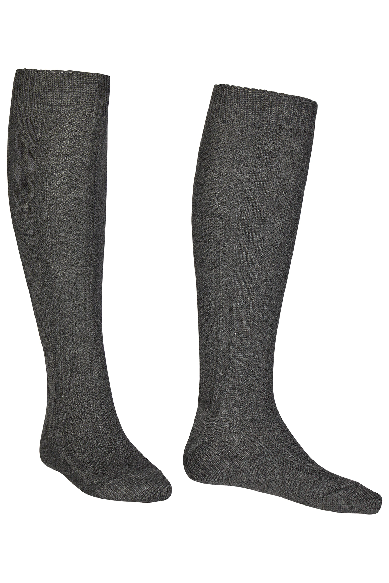 Klassischer Trachtenkniestrumpf in 3 schönen Farben. Den Strumpf gibt es in Tanne, Marine und Grau. Der Strumpf zeigt ein gestricktes Zopfmuster und hat für besseren halt ein Gummiband im Bund gezogen.