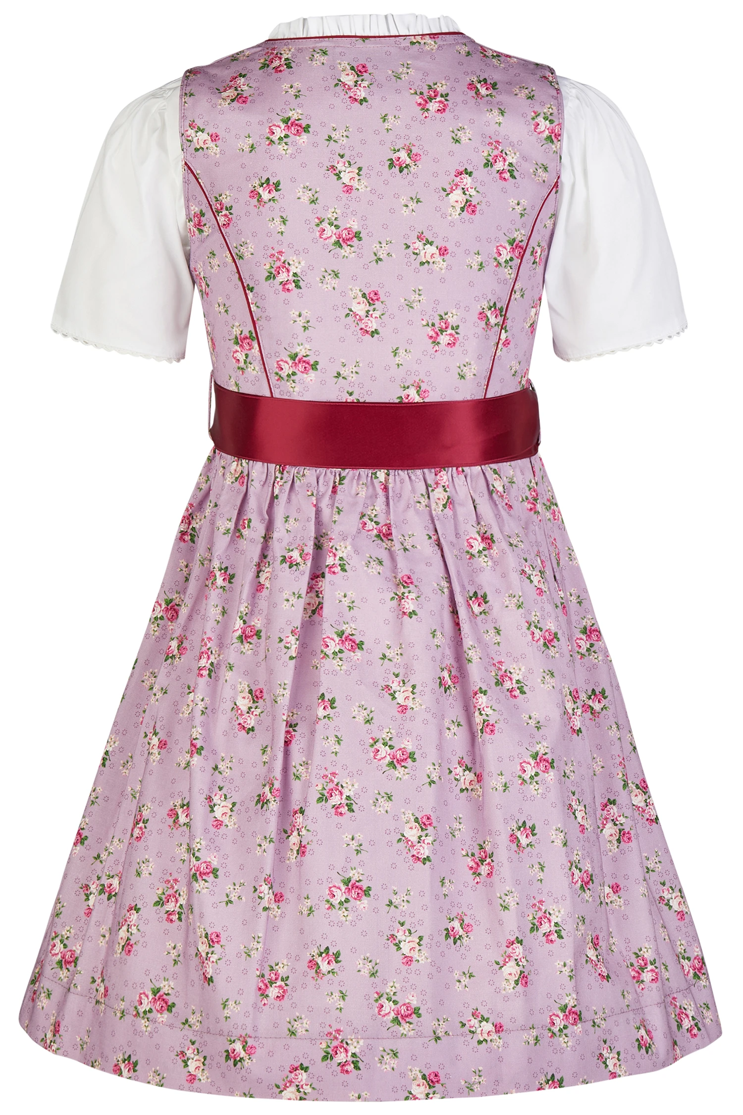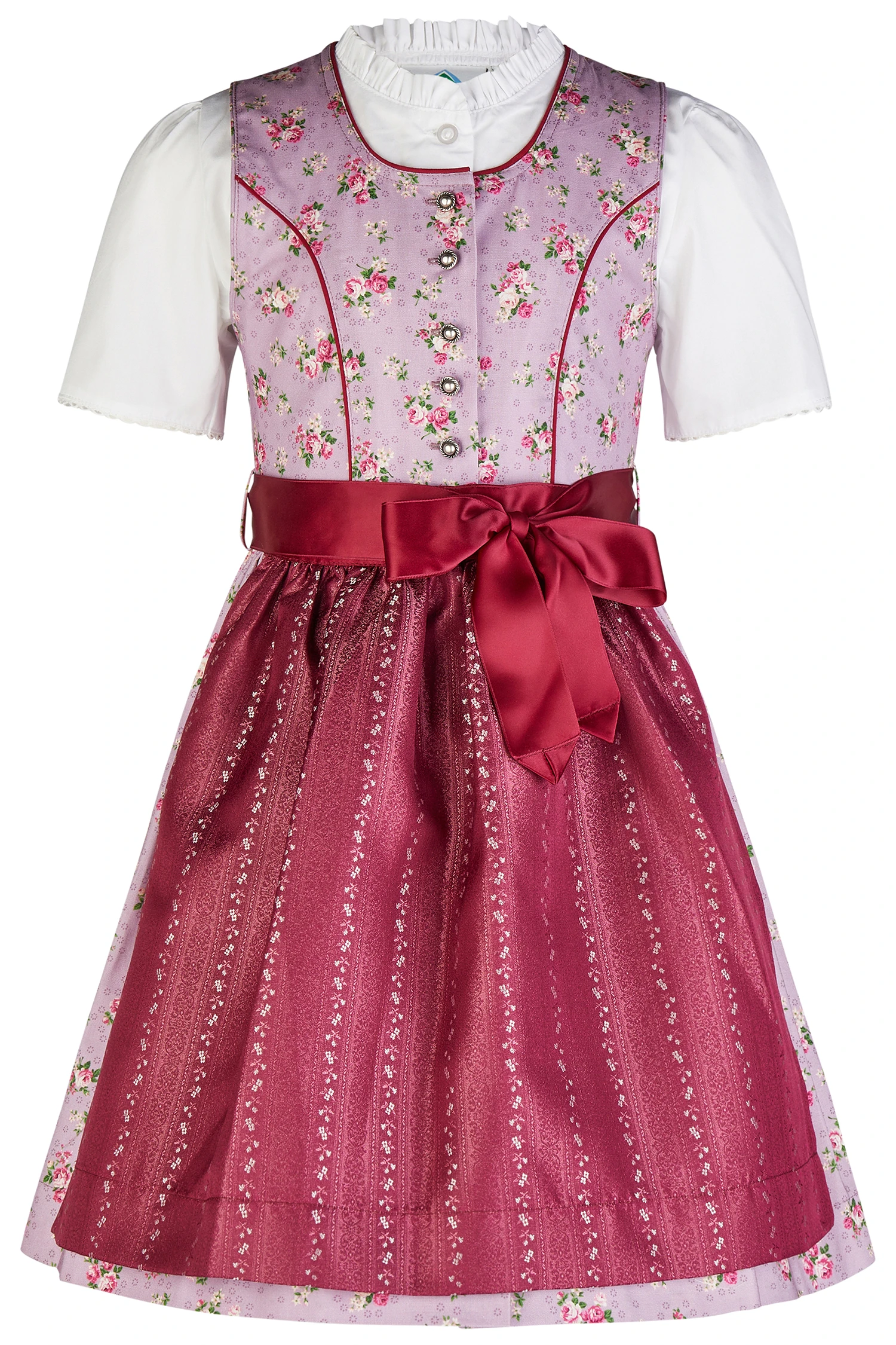 Schönes Kinderdirndl in Beerigen Farben. Das Dirndl hat einen hübschen Streublümchendruck der perfekt durch den Rankendruck auf der Schürze ergänzt wird. Zum Dirndl gehört neben der Schürze ebenso die Bluse, welche am Leib aus komfortabler Baumwolle gefertigt ist.