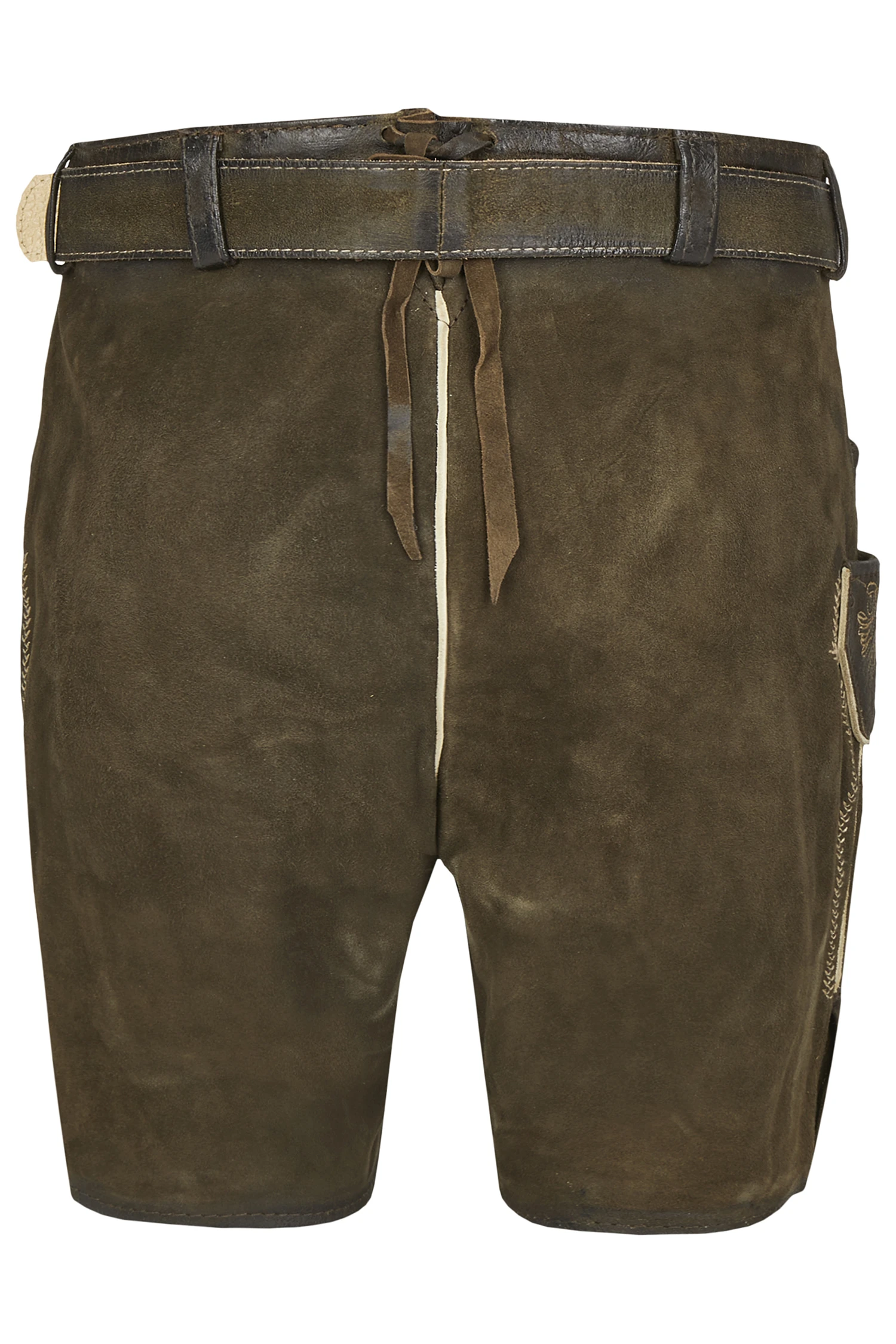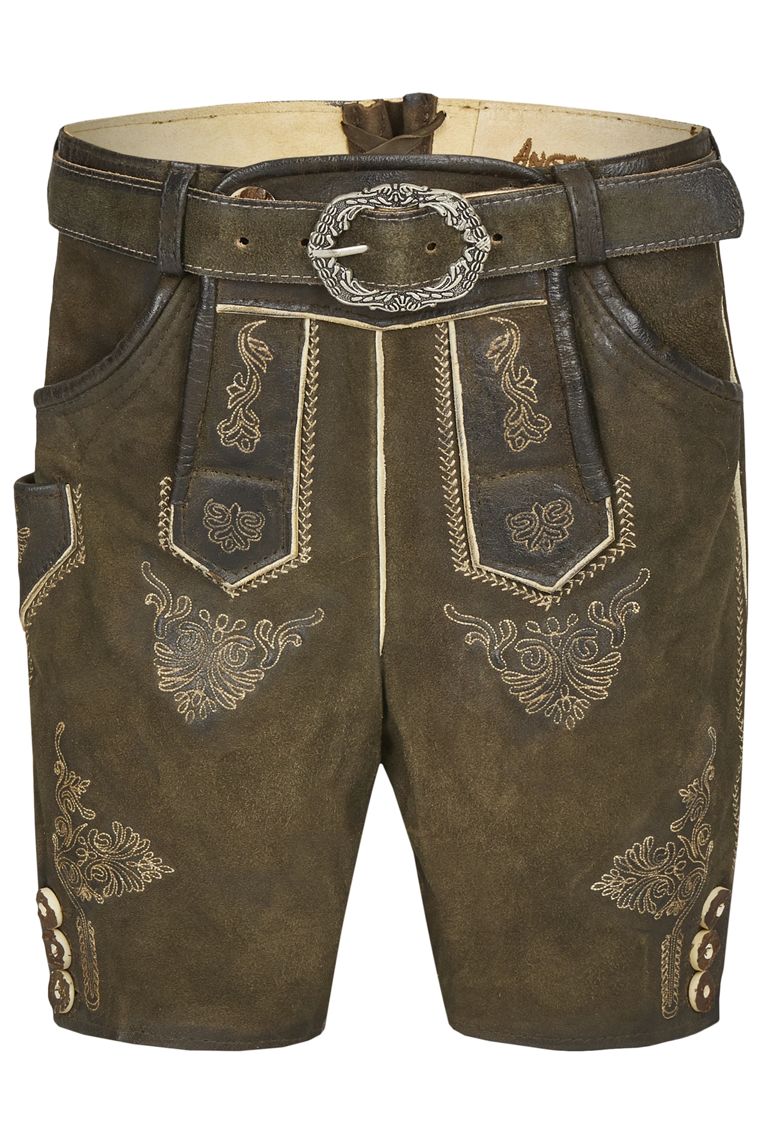 Kurze Lederhose mit praktischem Gürtel in den Farben Braun oder Schwarz. Die Lederhose hat im klassischen Stil Stickereien am Latz und am Bein und eine Messertasche am Bein. Sie hat 2 praktische Einschubtaschen und ein Lederband am Gesäß zum regulieren der Weite.