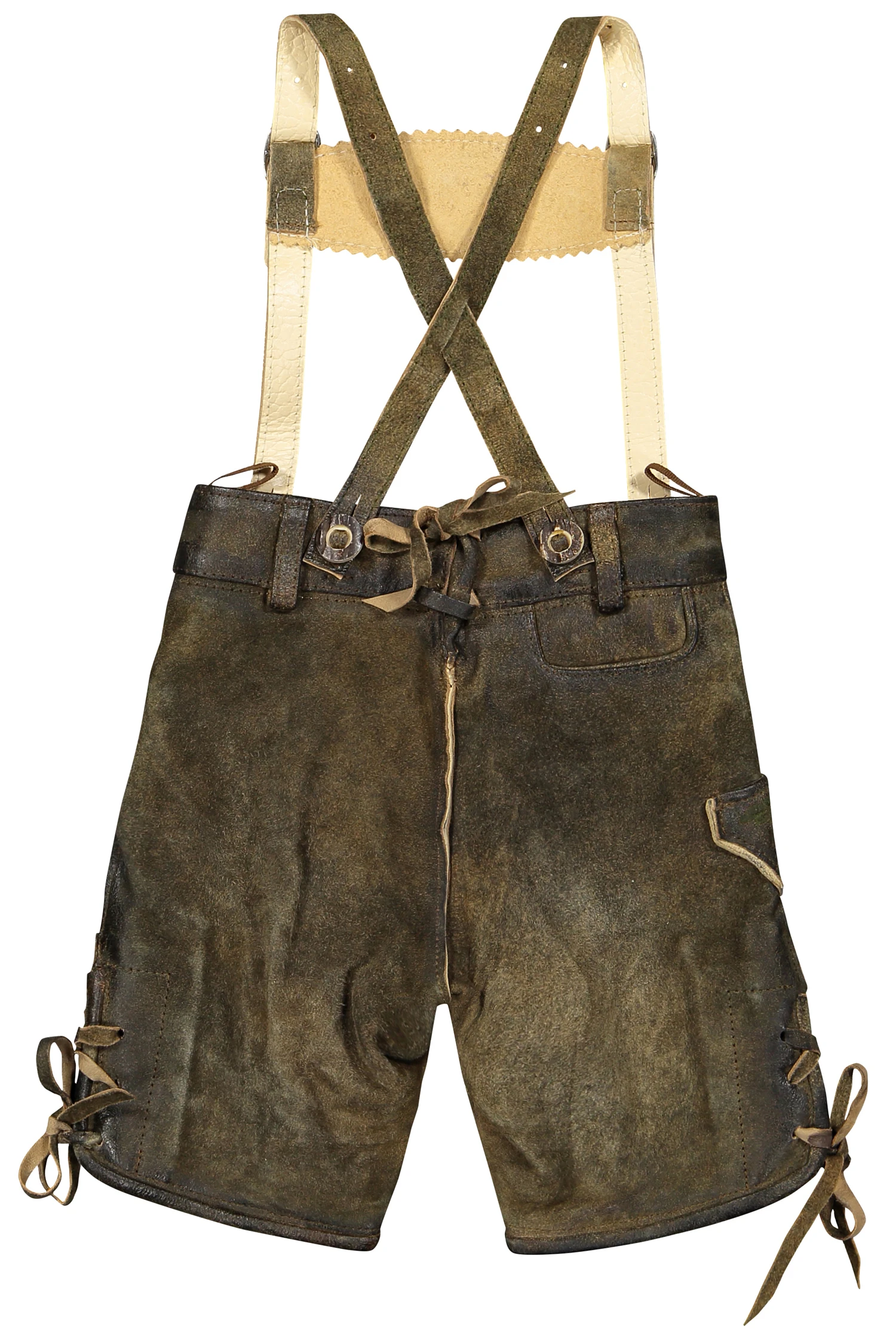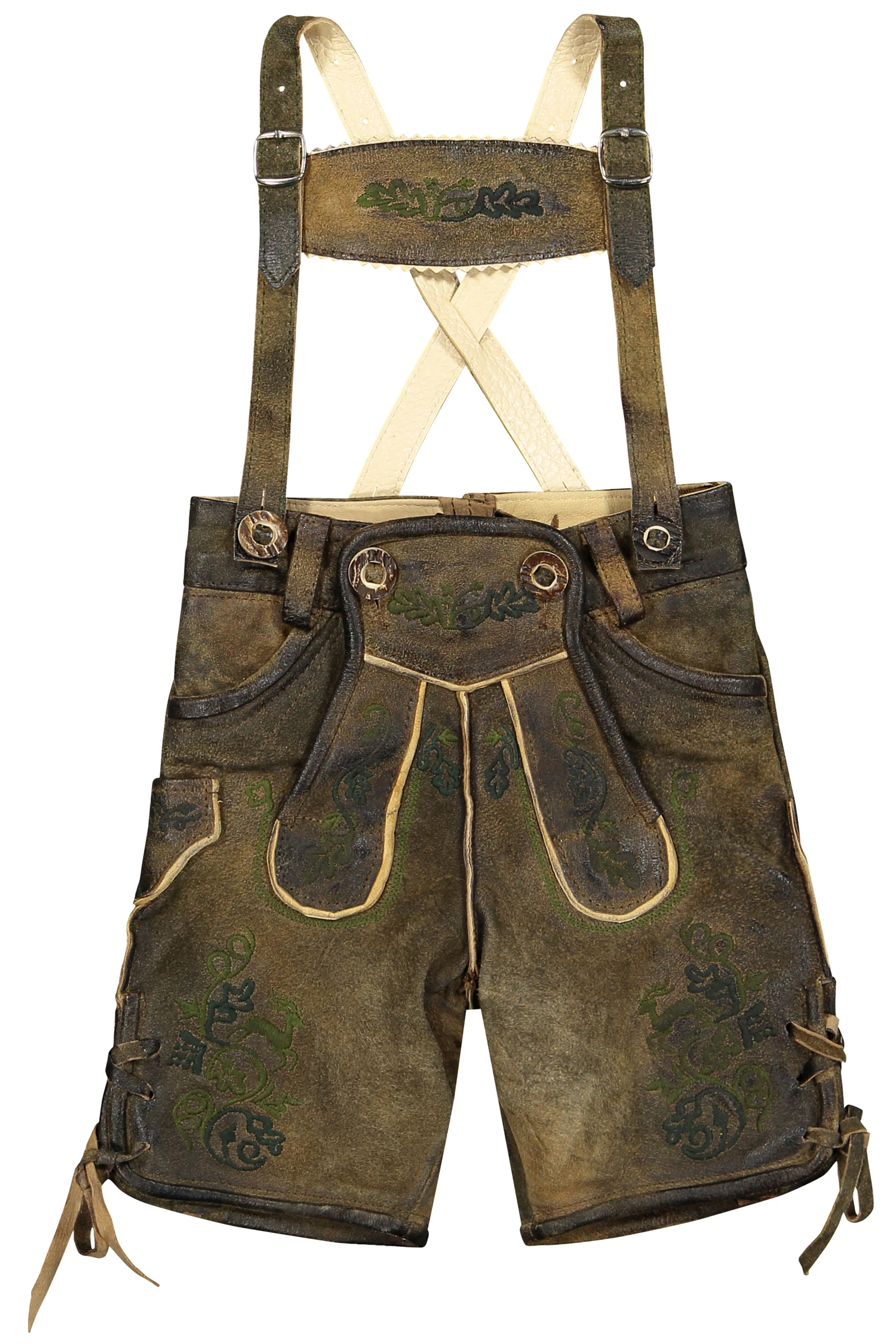 Die aufwendig gearbeitete Lederhose in Braun ist mit allerlei aufwendigen Details versehen. So findet sich auf beiden Beinen eine hübsche Stickerei in 2 Grüntönen, die einen Hirsch, Ranken und Eichenlaub zeigt. Ein geknöpfter Latz sowie Schnürungen auf der Rückseite sorgen für hohen Tragekomfort . Die 3 Taschen bieten Platz für persönliche Gegenstände. Das Design der Hose wird durch den charakteristichen Used-Look gekonnt vollendet. Die Stegträger sind ebenso mit Stickereien geziert und werden mit der Lederhose geliefert.