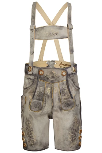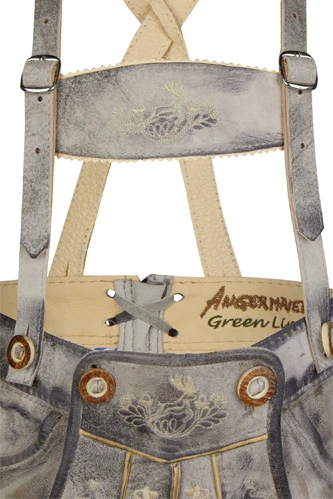 Die Kinderlederhose „Kasper Kid Vegetabil“ ist in zwei verschiedenen Farben erhältlich. Die Lederhose wurde mit typischen und traditionellen Stickereien verziert und besitzt rustikale Knöpfe in Hirschhornoptik, die zum Öffnen des Latzes sowie zum Abnehmen der Lederhosenträger dienen.