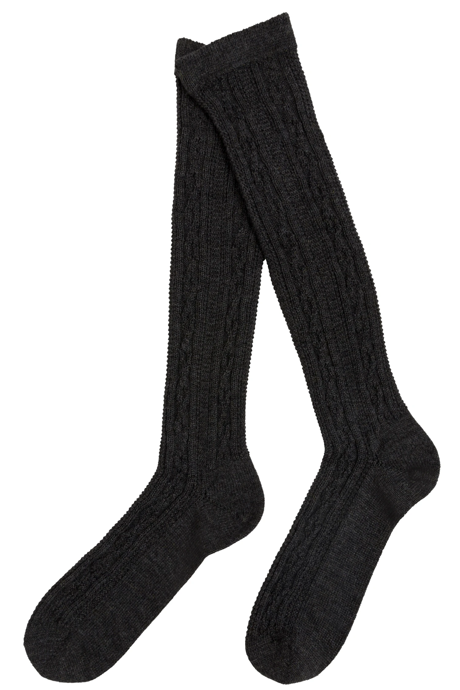 Der Strumpf zeigt ein gestricktes Zopfmuster und hat für besseren halt ein Gummiband im Bund gezogen.