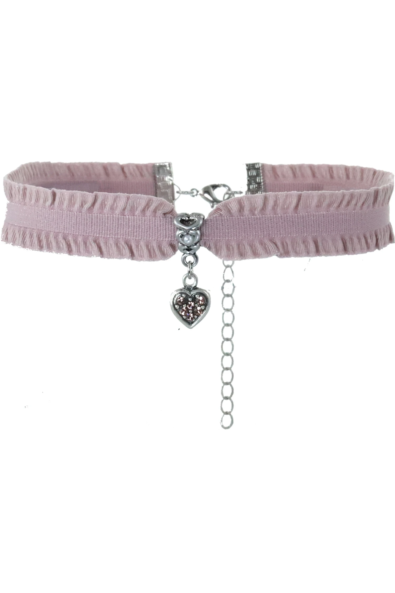 Feiner Halsschmuck aus zwei Bändern mit Rüschen. An dem Kropfband findet sich ein lieblicher Herzanhänger in Silber. Durch den Stretch-Anteil schmiegt sich das Band wunderbar an den Hals.