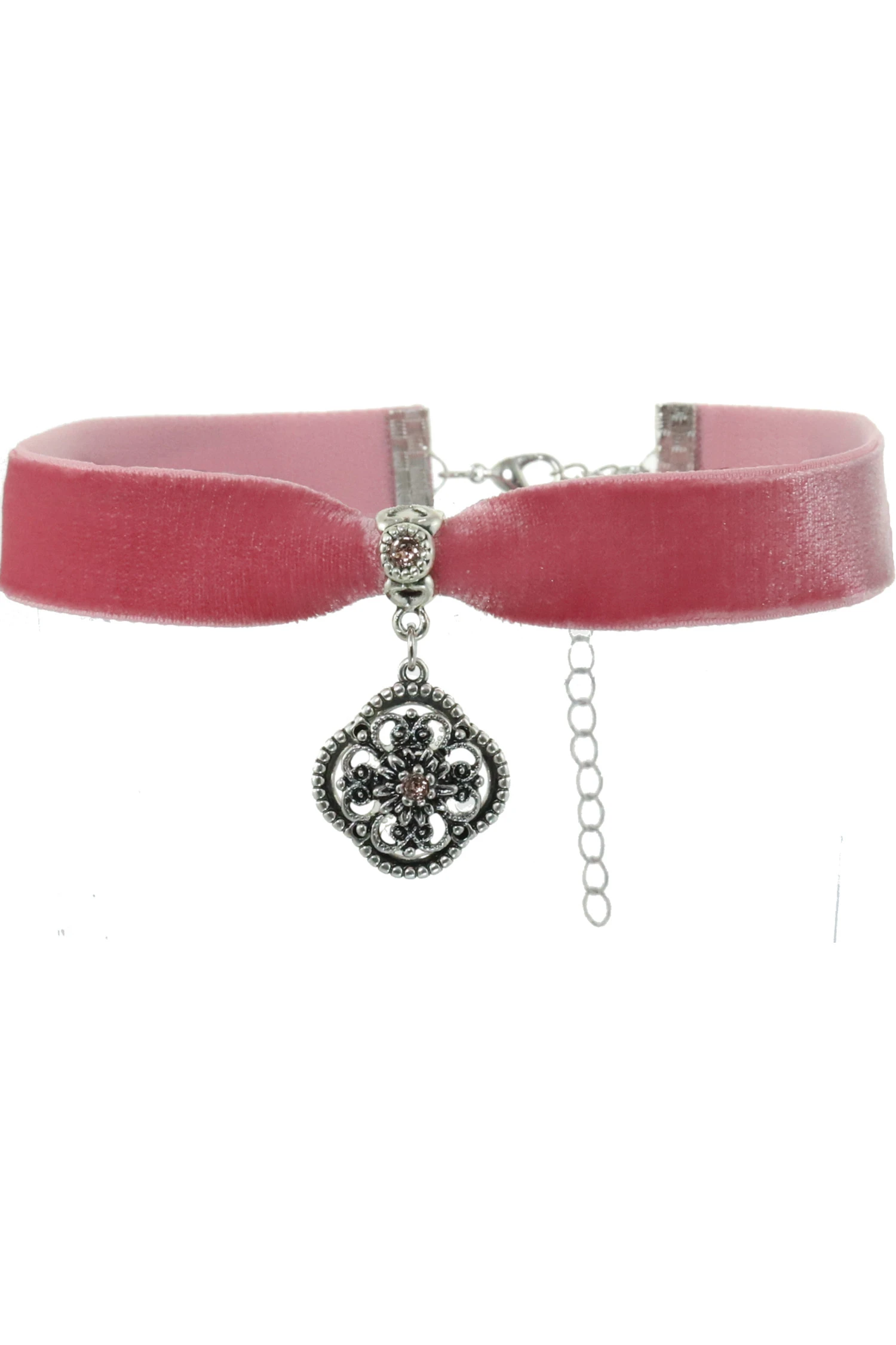 Feines Samtband mit hübscher schmucksteinbesetzter Brosche. Durch den leichten Stretch im Band schmiegt sich dieses wunderbar an.