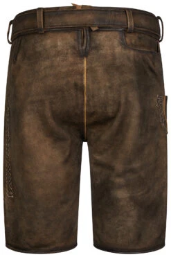 Die Lederhose wird vorne mit dem Latz geschlossen und hat einen auf die Hose abgestimmten Gürtel mit Koppelschließe. Durch die Lederbänder am Beinabschluss und am Gesäß kann die Weite angepasst werden.