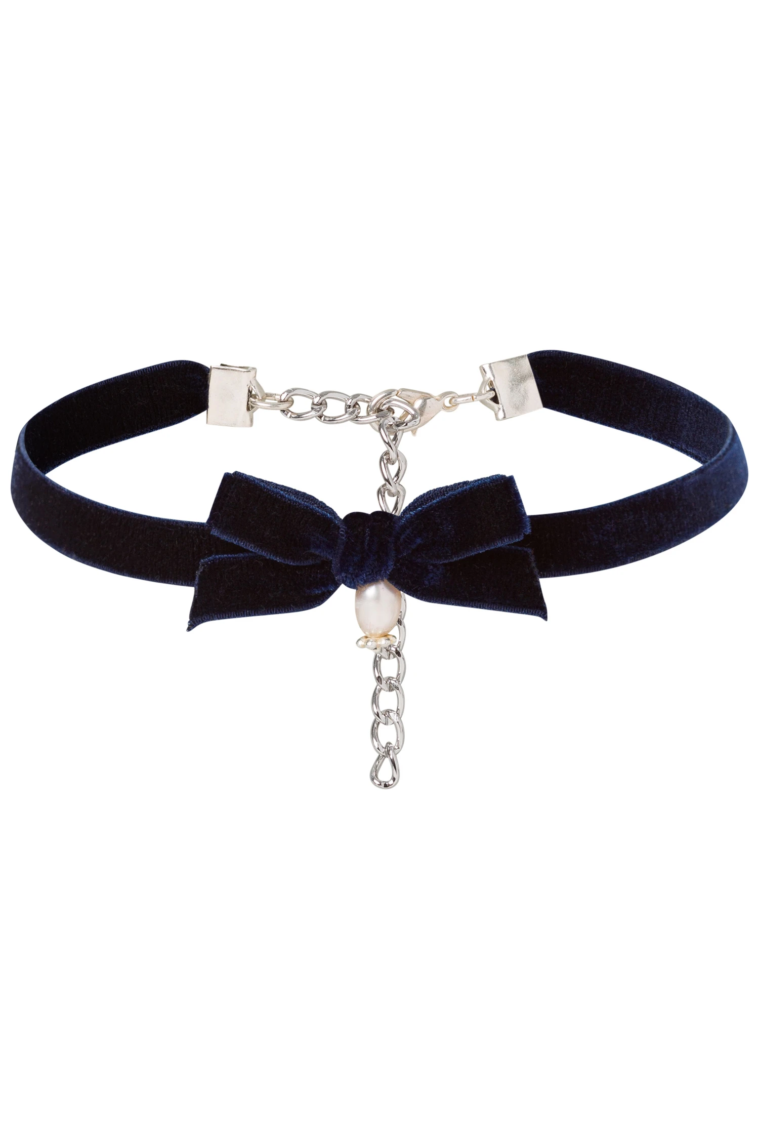 Zartes Kropfband mit feiner Schleife und kleinem Perlenanhänger. Das Kropfband passt sich durch den Stretch-Anteil wunderbar an den Hals an und ist in vielen Farben erhältlich.
