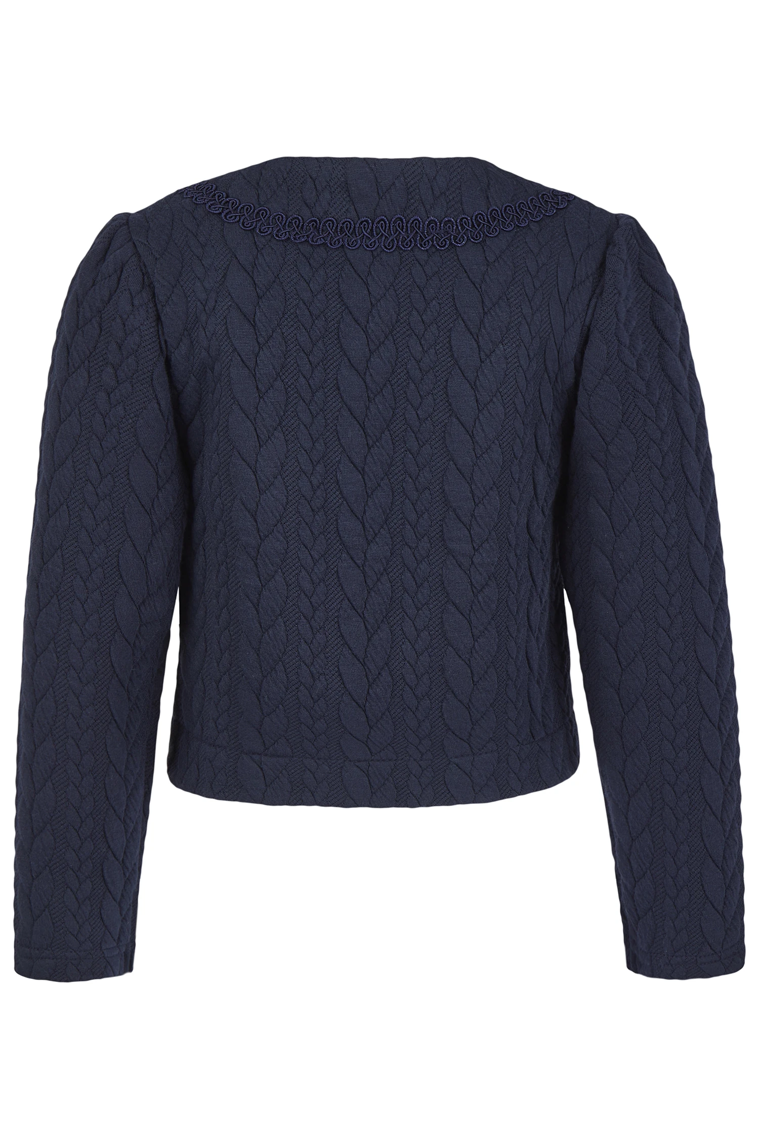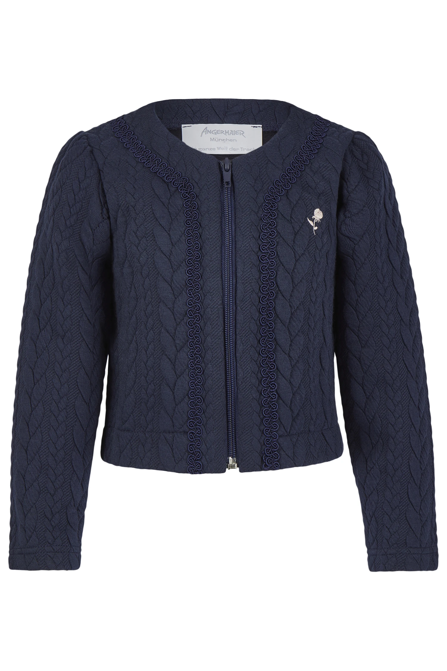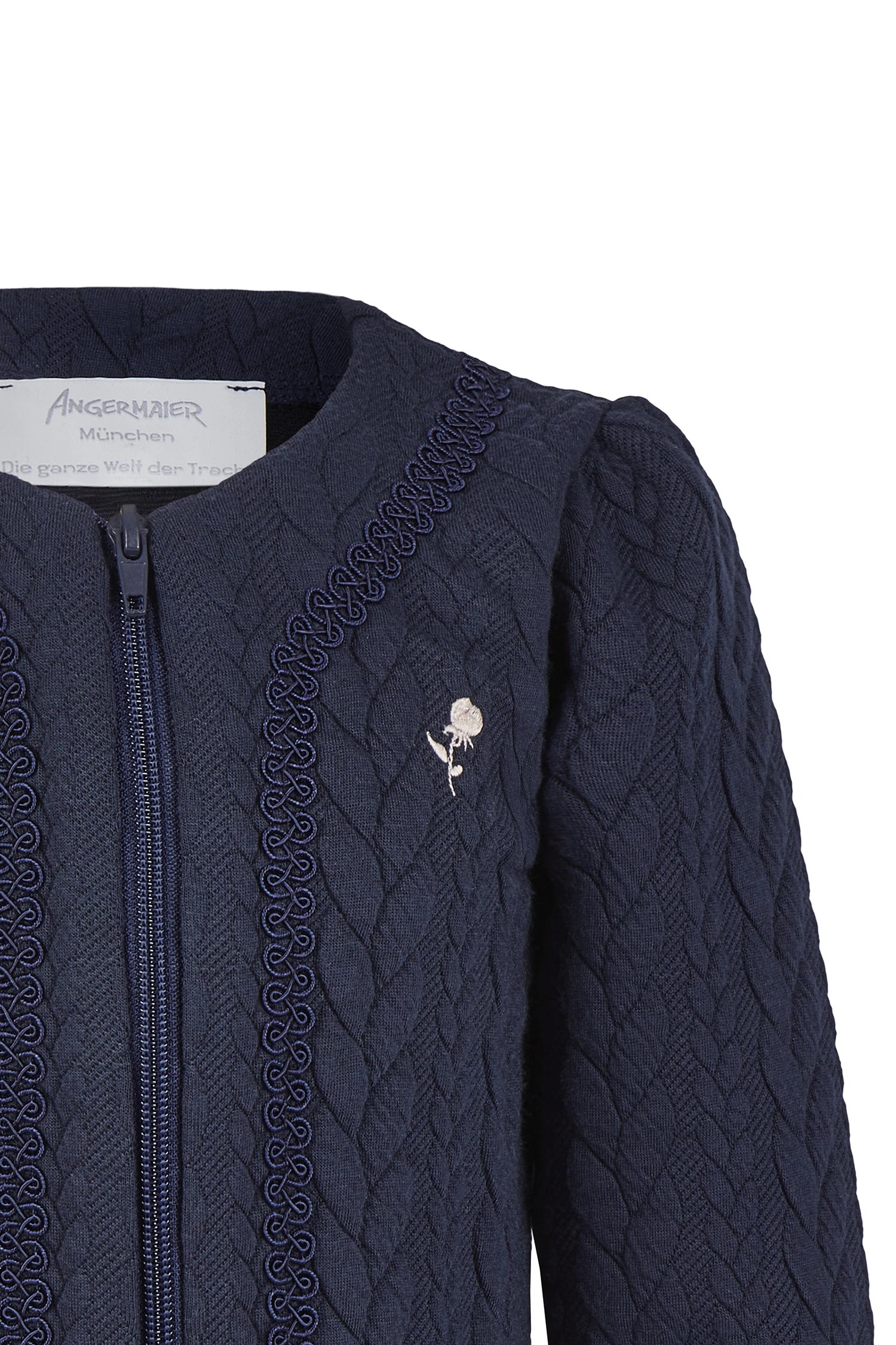 Trachtenjacke für Kinder in Marine. Die Jacke zeigt ein schönes Zopfdesign, verspielte Schnörkeleien und auf der linken Seite eine eingestickte rosafarbene Rose.