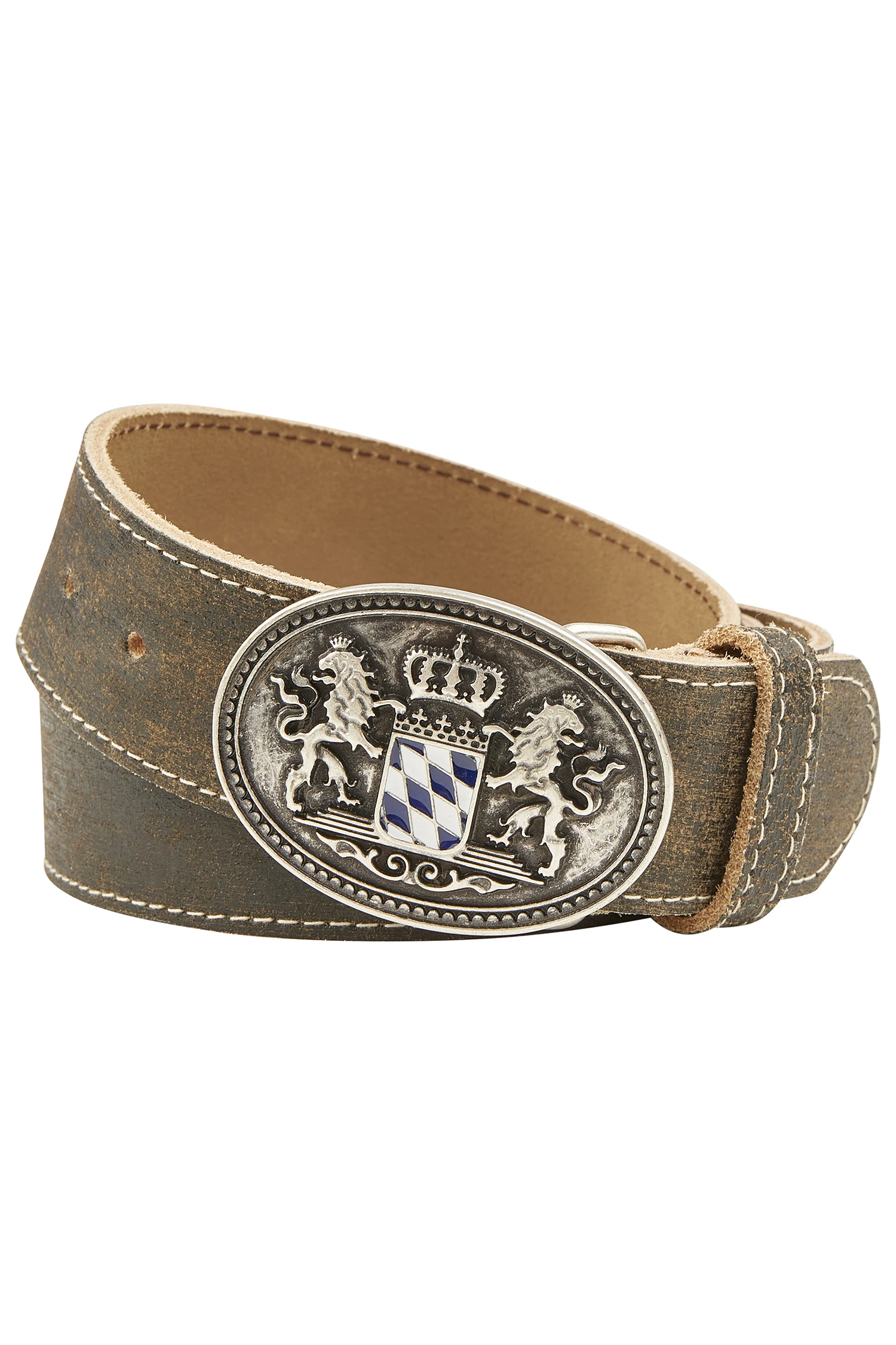 Brauner Trachtengürtel für Herren. Der Gürtel ist aus Leder gefertigt und wird von einer Koppel geschlossen, die zwei Löwen und das Bayernwappen zeigt.