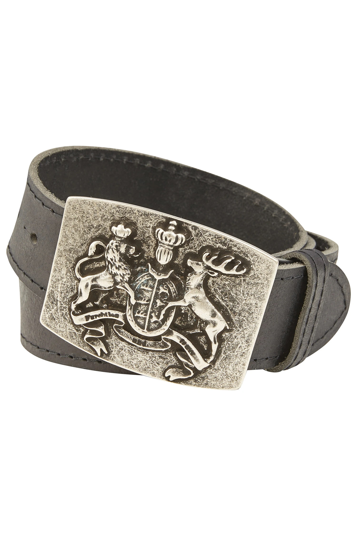 Schwarzer Trachtengürtel für Herren. Der Gürtel ist aus Leder gefertigt und wird von einer Koppel geschlossen, die ein Löwen und einen Hirschen sowie ein Wappen zeigt.