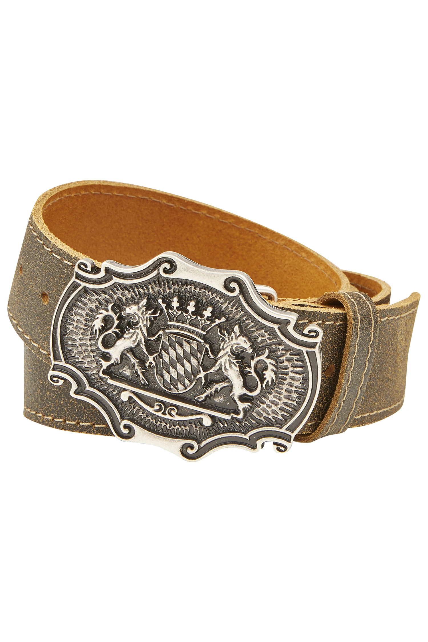 Brauner Trachtengürtel für Herren. Der Gürtel ist aus Leder gefertigt und wird von einer Koppel geschlossen, die zwei Löwen und das Bayernwappen zeigt.