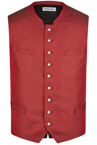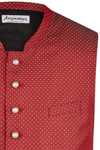 . Elegante Weste „Ansbach“ für Herren. Sie zeigt hübsche Streublümchen und das Rot des Jacquards changiert elegant in die Farbe Oliv. Die Weste wird auf der Vorderseite durch eine durchgehende Knopfleiste aus silbernen Kugelknöpfen geschlossen und hat zwei Hüft-, zwei Brust- sowie zwei Innentaschen. Der Westenrücken aus Baumwolle ist in kontrastierendem Schwarz gehalten und hat einen Dragoner zum Verstellen der Rückenweite. Mit der passenden Lederhose von Angermaier dazu zaubern Sie einen edlen Trachten-Look, der Sie sowohl für die Wiesn als auch für weitere festliche Anlässe perfekt kleidet.