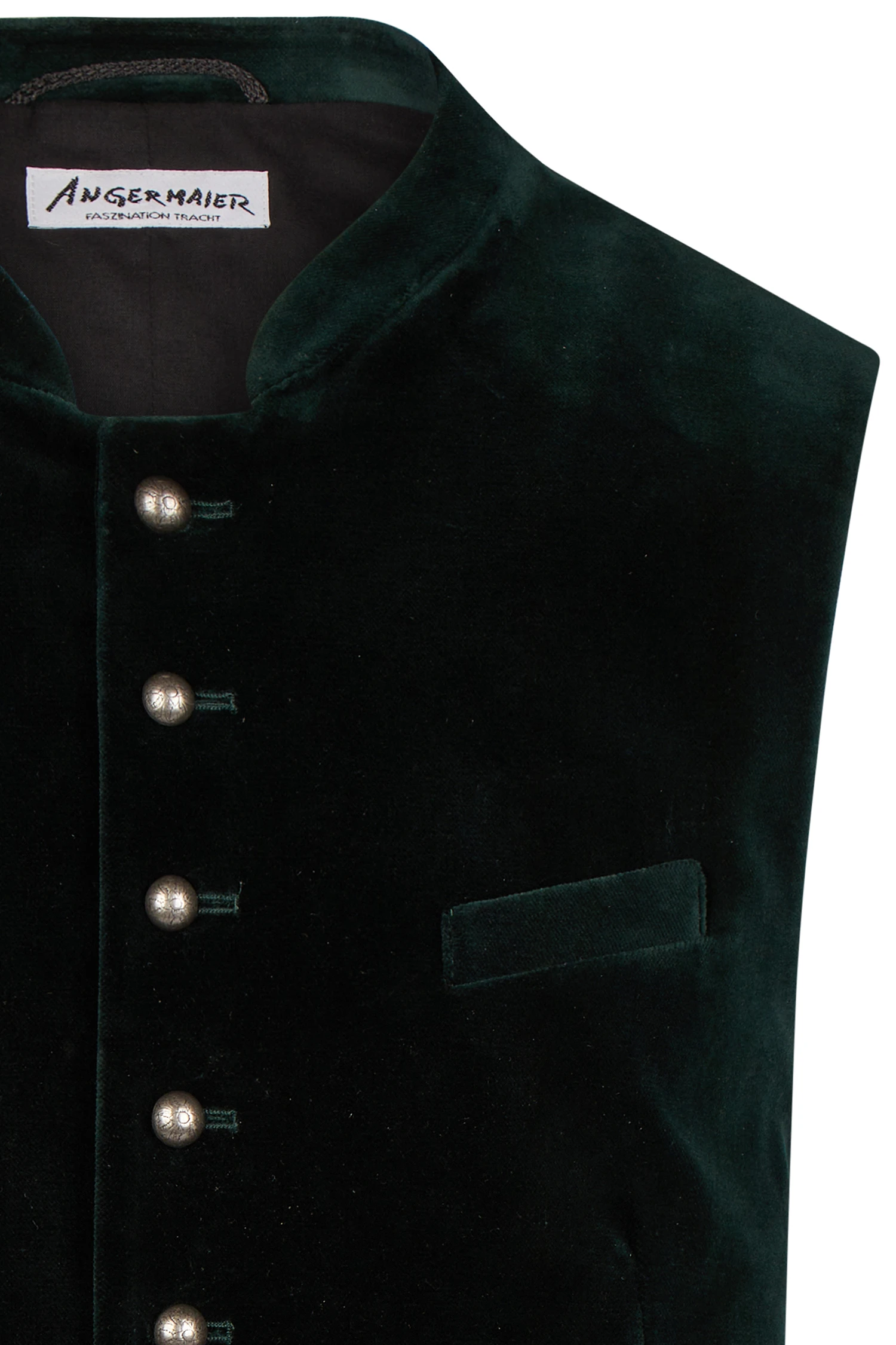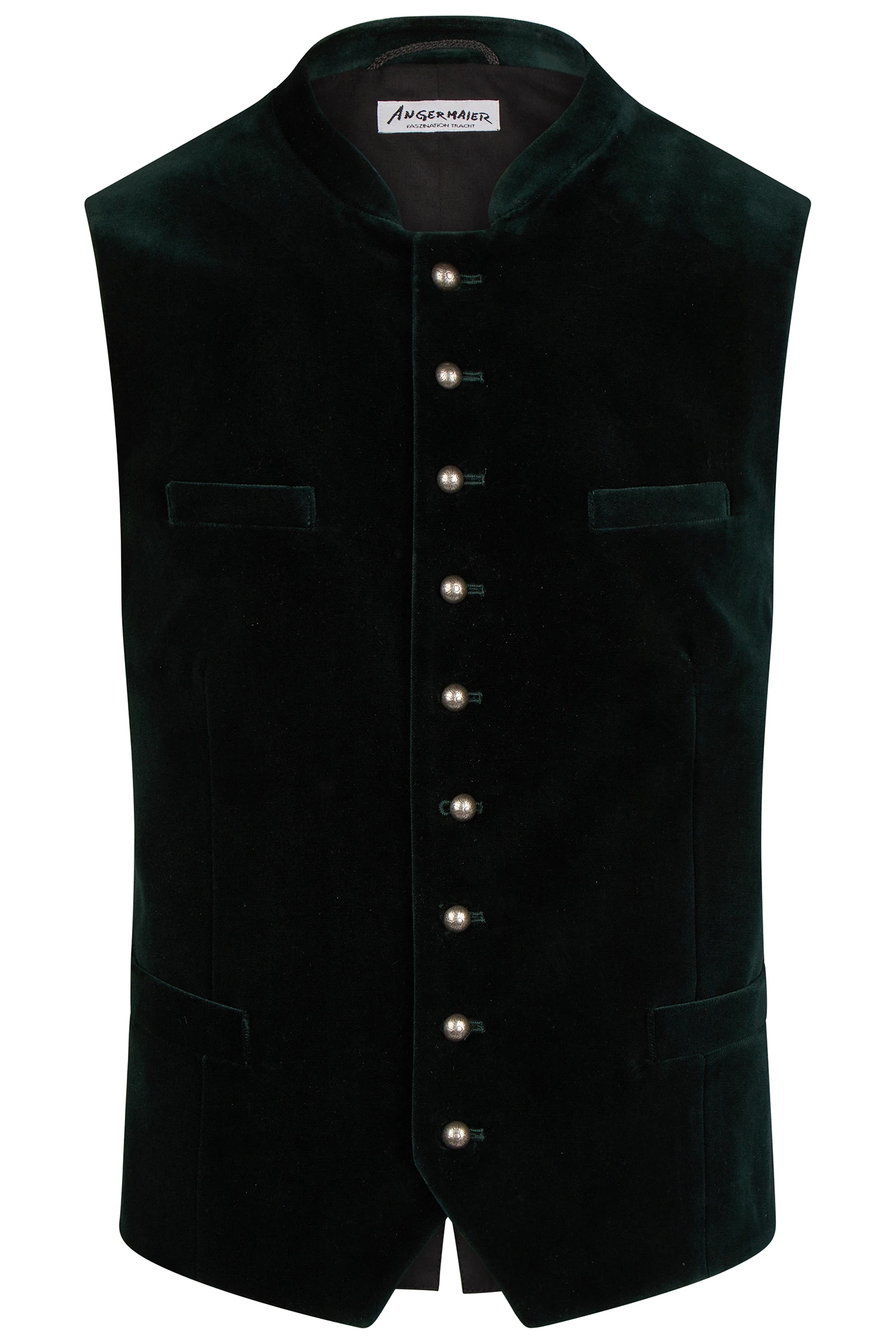 Elegante Samtweste „Ansbach“ in Rot, Blaut & Grün aus der Kollektion von „Angermaier“. Die Trachtenweste ist besonders figurnah geschnitten und passt sich durch den Stretchanteil sehr gut an. Schöne Akzente setzen die silbernen Schmuckknöpfe und die vier Paspeltaschen. Die Weste hat eine Innentasche und einen praktischen Dragoner am Rücken zum Regulieren der Weite.